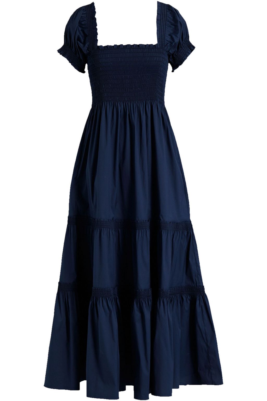 Navy Smocked Cotton Blend Poplin Midi Dress Sale Up To 70 Off The Outnet Tory Burch The Outnet